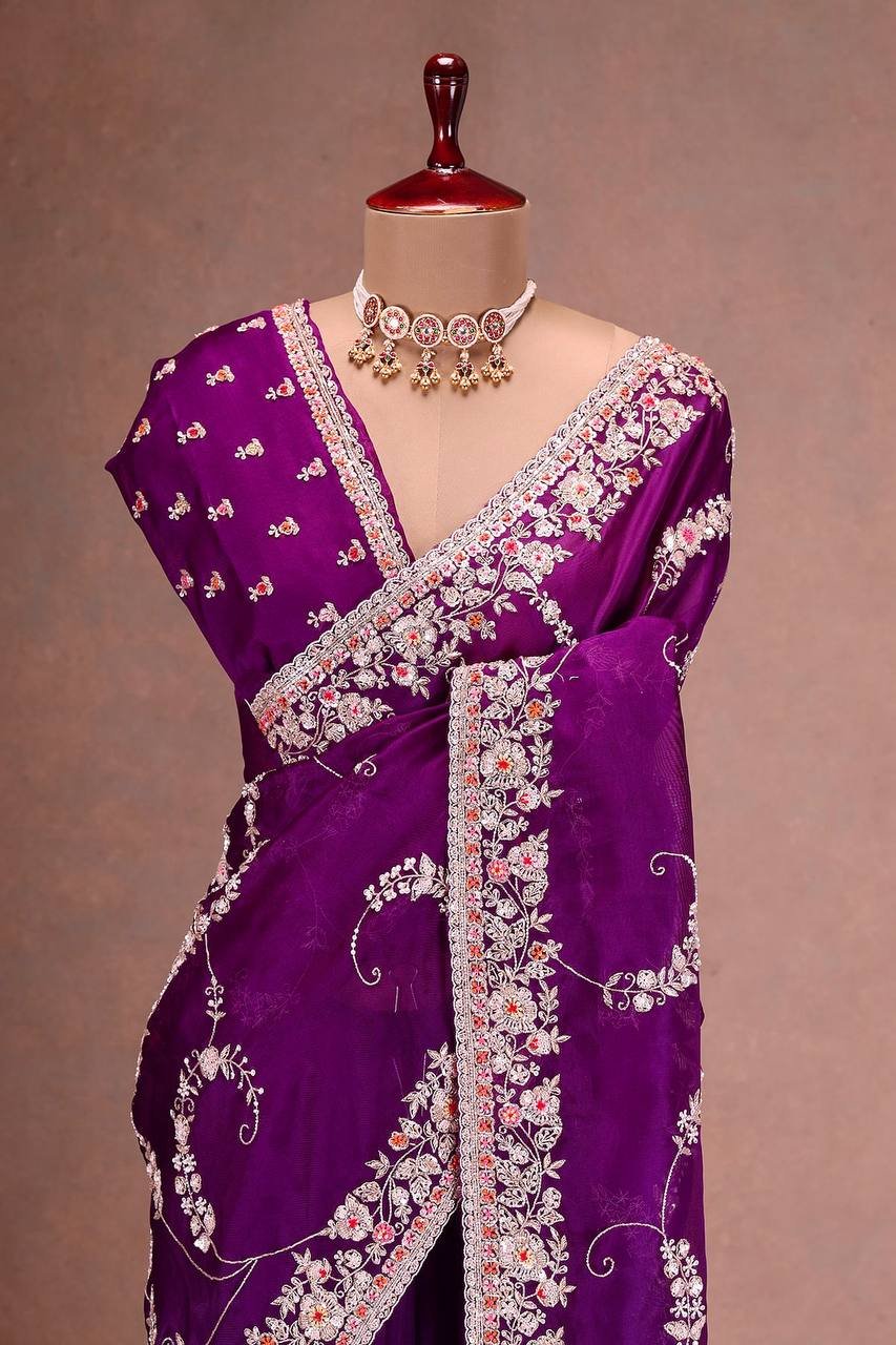 Premium Designer Saree in Jimmy Cho Fabric | Heavy Embroidery & Sequins | Unstitched Blouse